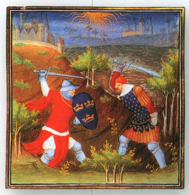Так бились благородные рыцари целый день без передышки... И продолжалась битва до самой ночи, а к тому времени уже сто тысяч человек полегло мертвыми на холмах.