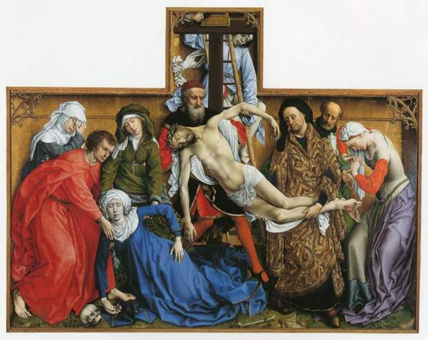 # Томас Мэлори сообщает, что тело Артура несли на руках и осторожно положили в "барку". Наверное, тут отразилось снятие тела Христа с креста, рис.7.28. Тело бережно сняли и завернули в плащаницу.