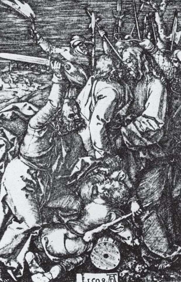 Рис. 1.30. Гравюра А. Дюрера на тему «Арест Иисуса». Иуда целует Христа, а Петр наносит размашистый удар мечом, причем не очень ясно – кому. То ли рабу, лежащему у его ног, то ли самому Иисусу. Взято из [265:1], с. 453.